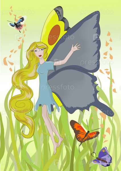 Девочка с крыльями бабочки в траве. Векторная иллюстрация
