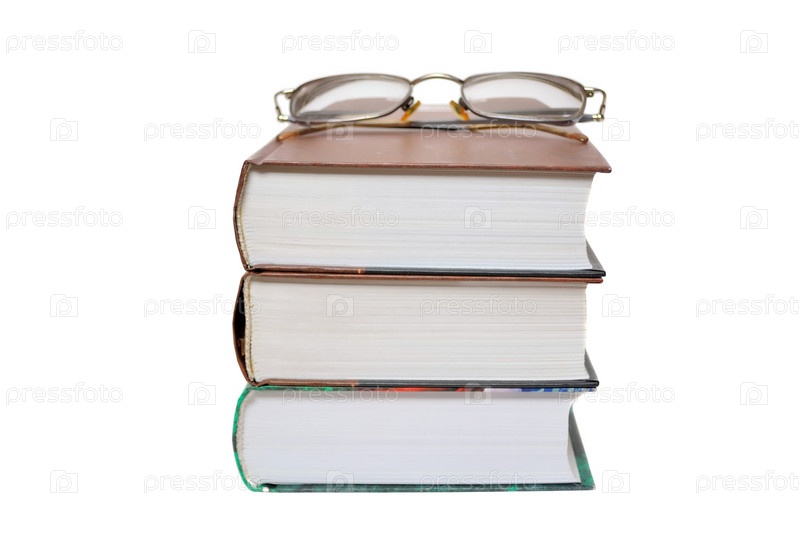 Очки, лежащие на стопке книг. Белый фон