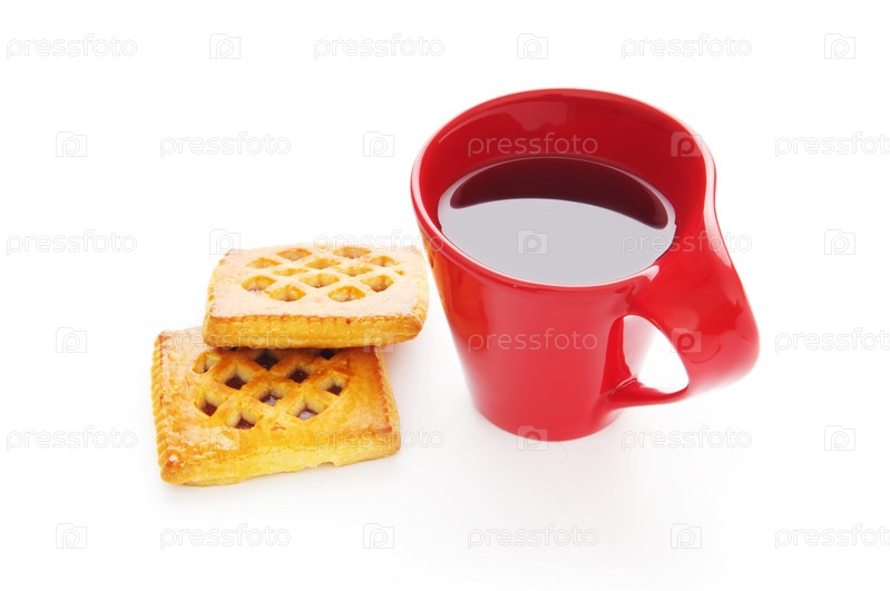Чашка чая и свежее печенье на белом фоне
