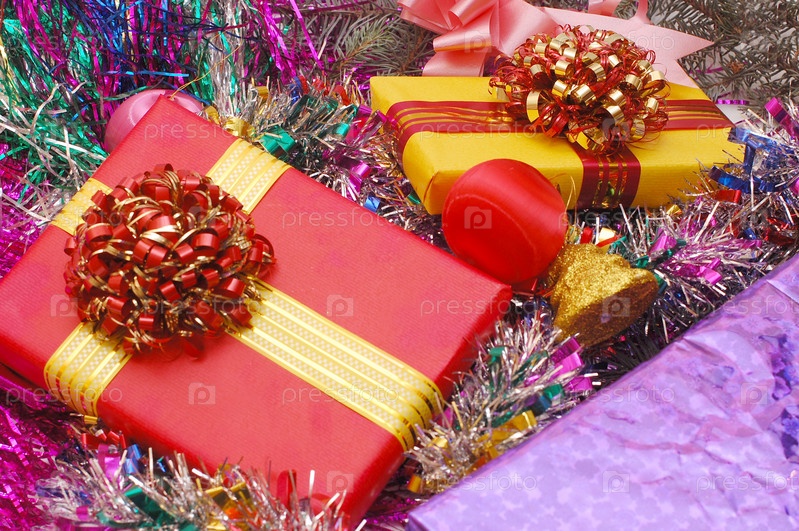 Коробки с подарками на фоне новогодних украшений