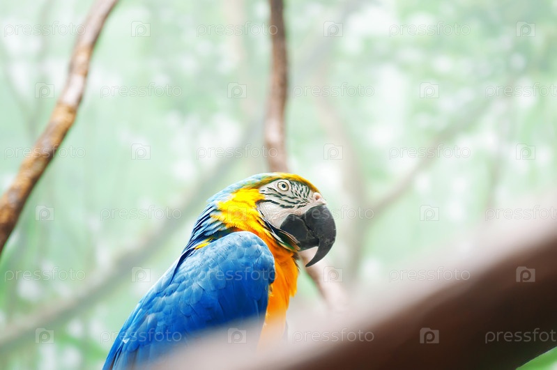 Яркий желто-голубой попугай ара сидит на ветке