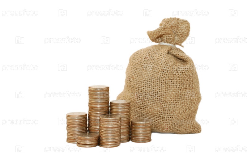 Холщовый мешочек и монеты на белом фоне