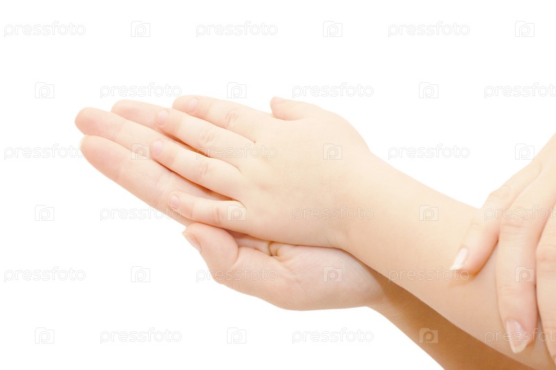 Руки матери и ребенка на белом фоне