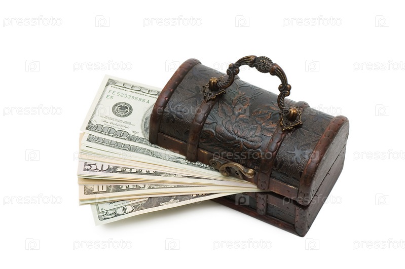 Пачка долларов в маленьком сундуке на белом фоне