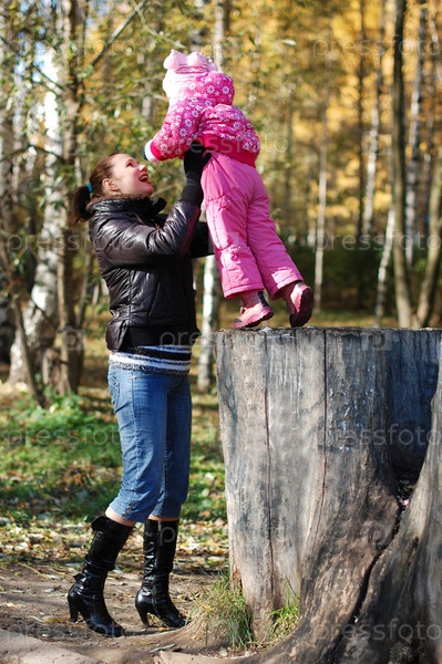Портрет молодой мамы с дочерью в осеннем парке