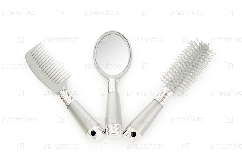 Две серые расчески и зеркало на белом фоне