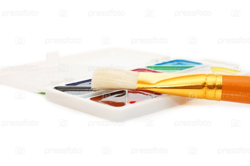 Акварельные краски и кисть крупным планом на белом фоне