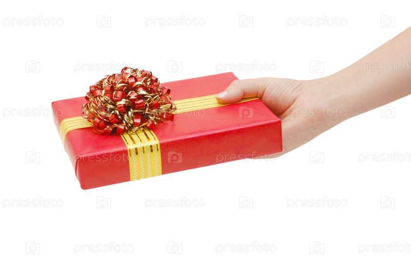 Рука с красной подарочной коробкой, изолированная на белом фоне