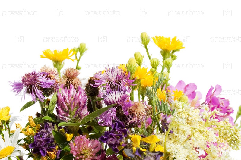 Букет полевых цветов крупным планом на белом фоне