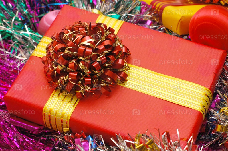 Красная подарочная коробка на фоне новогодней мишуры