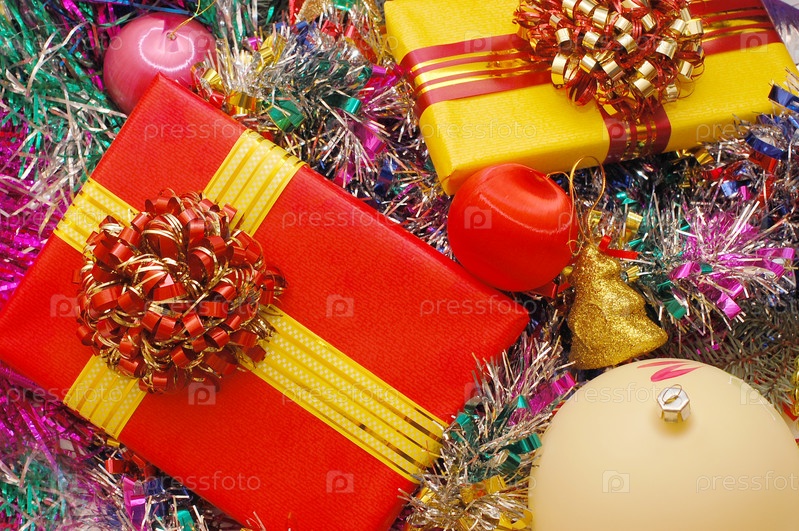 Коробки с подарками и елочные украшения лежат на новогодней мишуре