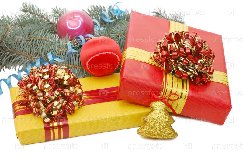 Подарки и елочные игрушки на белом фоне