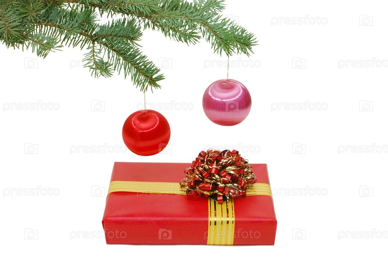 Подарок, лежащий под украшенной елкой