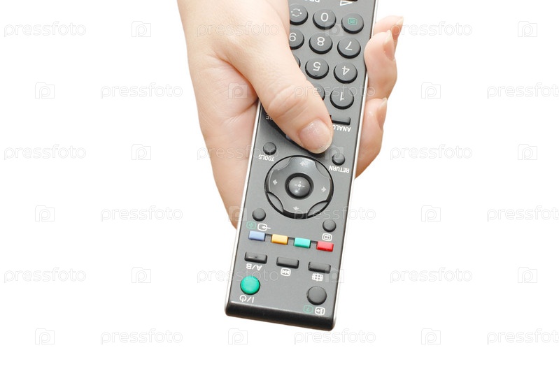 Пульт дистанционного управления в руке на белом фоне