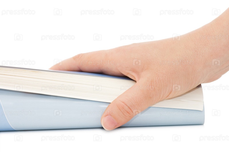 Рука держит свернутый журнал на белом фоне