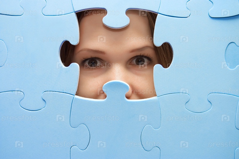 Девушка смотрит из голубой головоломки