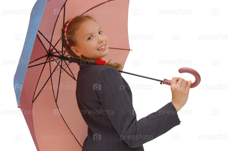 Улыбающаяся девочка в костюме и с зонтом на белом фоне