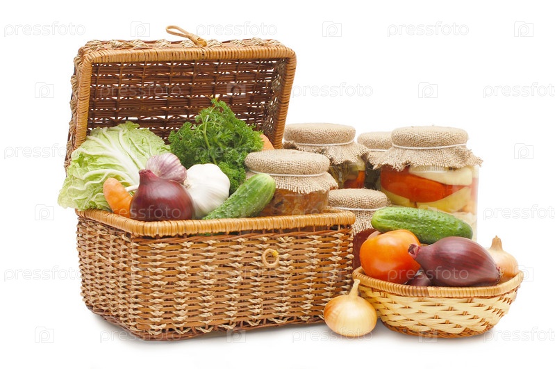 Свежие и консервированные овощи в плетеной корзине
