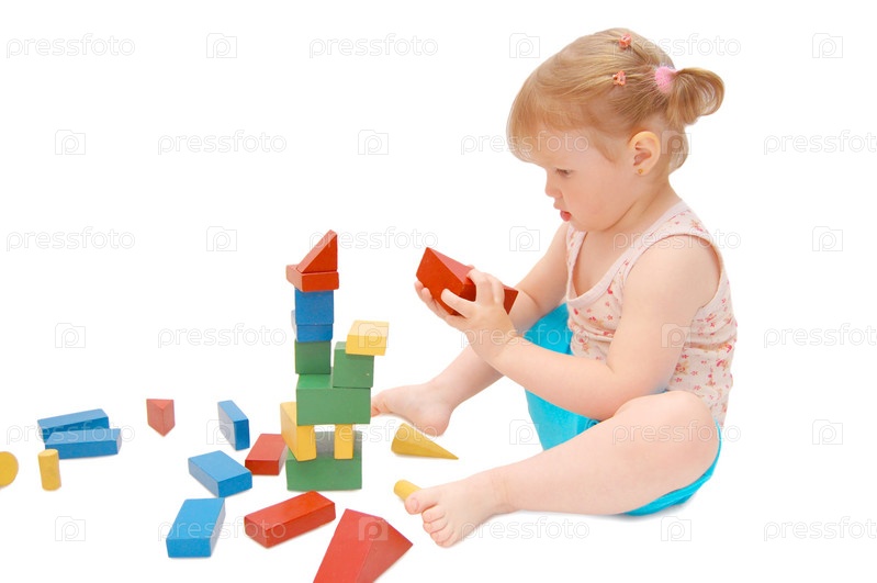 Маленькая девочка играет с кубиками на белом фоне
