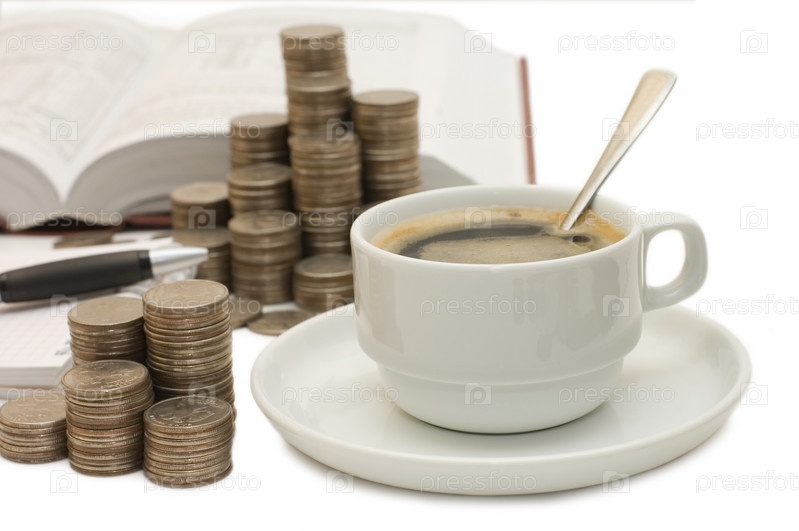 Книга, чашка кофе и золотые монеты изолированы на белом