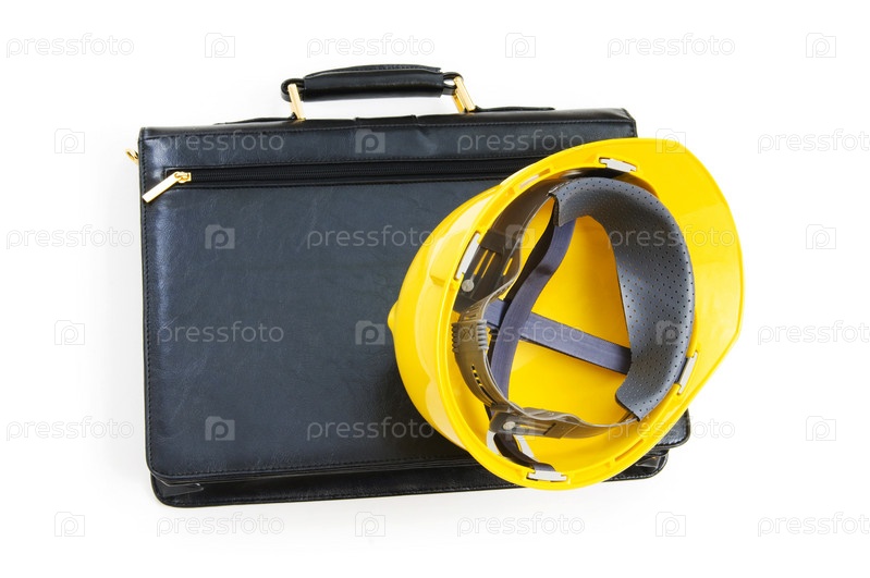 Портфель и строительная каска на белом фоне