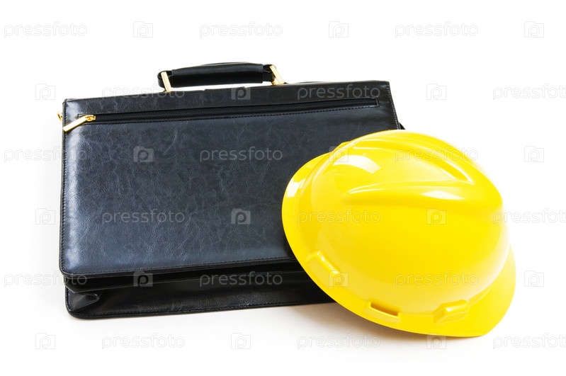 Портфель и строительная каска на белом фоне