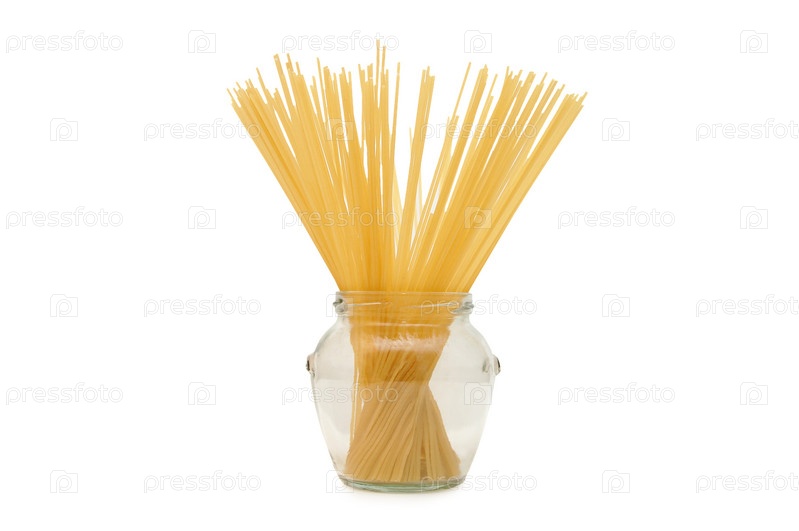 Спагетти в стеклянной банке крупным планом на белом фоне