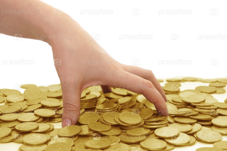 Женская рука загребает монеты на белом фоне