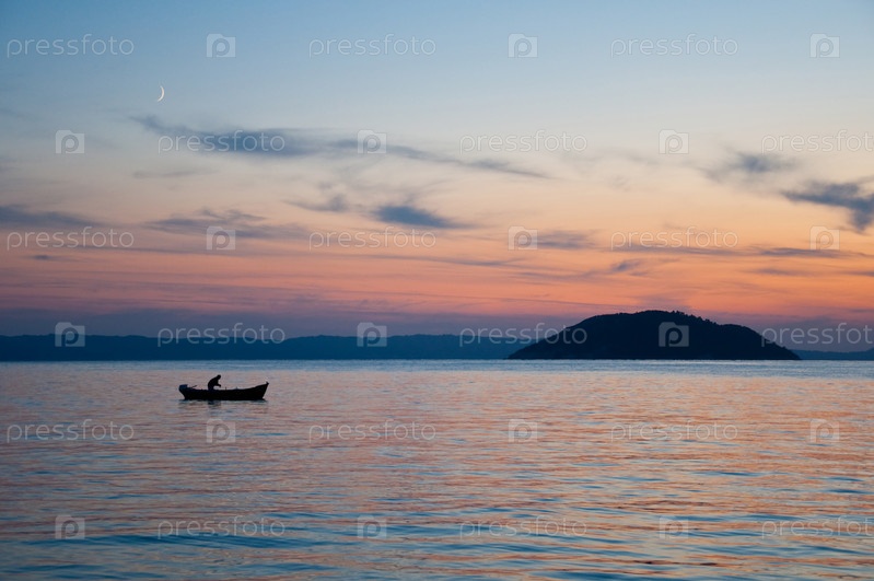Закат солнца, рыбак с сетями на лодке