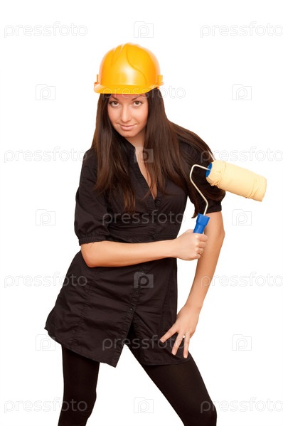 Симпатичная девушка в строительной каске держит малярный валик