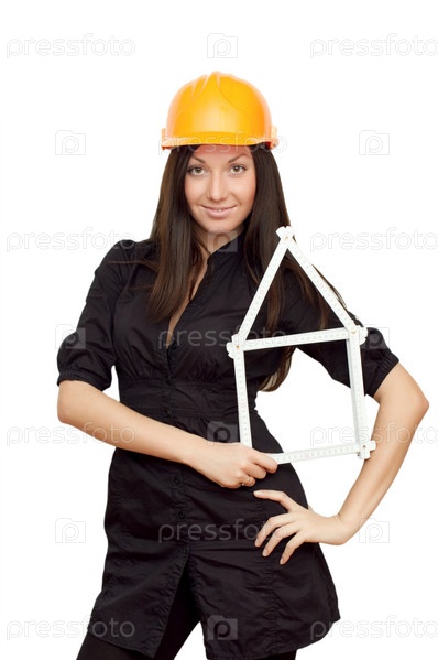 Симпатичная девушка в строительной каске с деревянным домиком в руках