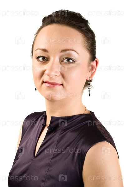 Молодая женщина смотрит в камеру, изолированная на белом фоне