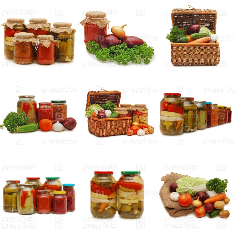 Коллаж из свежих и консервированных овощей на белом фоне