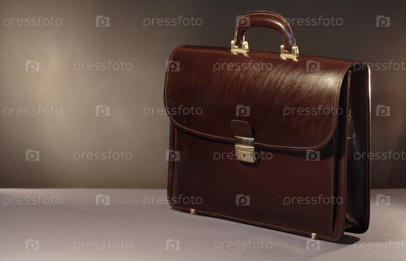 Кожаный коричневый портфель на сером фоне