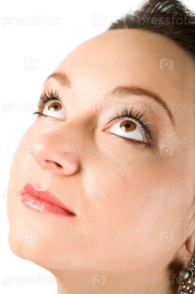Женщина, смотрящая вверх, белом фоне