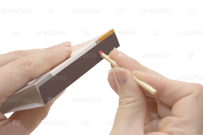 Рука, чиркающая спичкой, на белом фоне