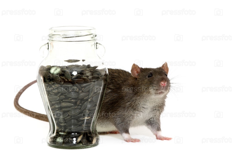 Большая серая крыса на белом фоне с семечками подсолнечника