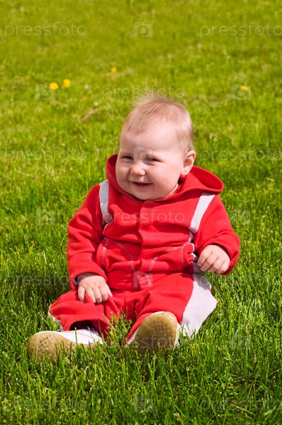 Ребенок в красной одежде сидит посреди зеленой травы и улыбается