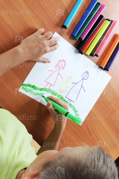 Мальчик рисует на бумаге карандашами