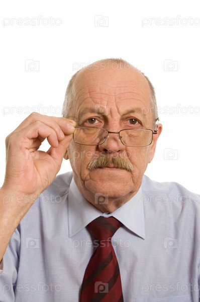 Пожилой мужчина в очках на белом фоне