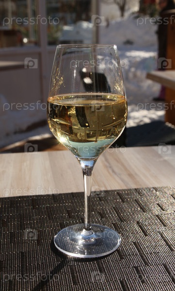 Стакан белого вина и пустой стакан на столе открытого ресторана