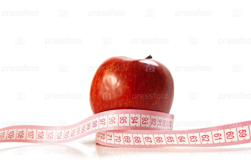 Красное яблоко и измерительная лента на белом фоне