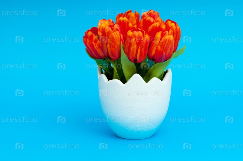 Тюльпаны в белой вазе на голубом фоне