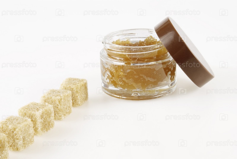 Скраб для тела и коричневый сахар на белом фоне