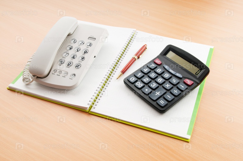 Калькулятор, телефон и ручка на тетради