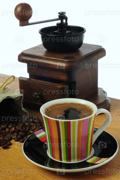 Ручная мельница и чашка с черным кофе на столе