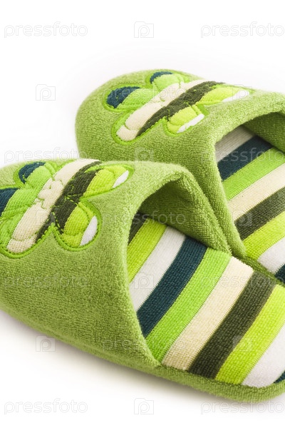 Зеленые тапочки крупным планом на белом фоне
