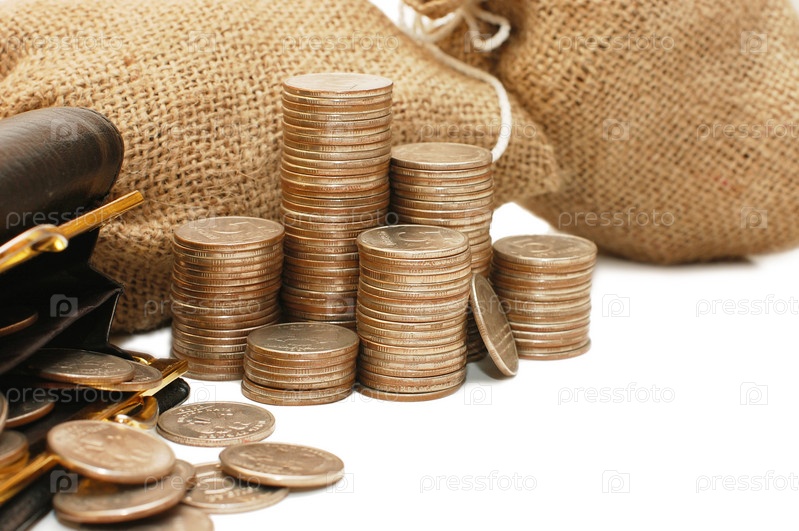 Кошелек, золотые монеты и холщовый мешок