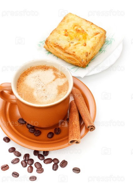 Чашка кофе и пирожное на белом фоне