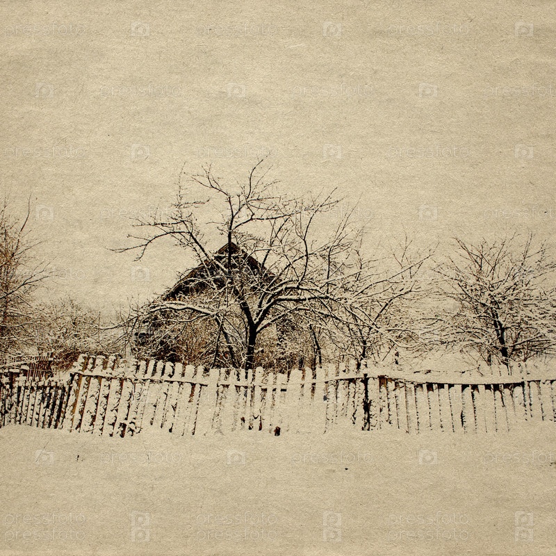 Заснеженный старый дом за забором